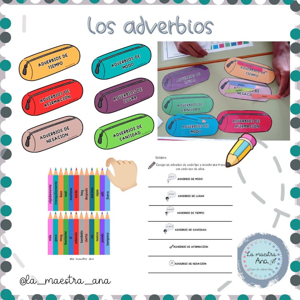 - Material manipulativo (a color) consistente en: estuches con los grupos de adverbios (modo, lugar, tiempo, afirmación, negación y cantidad) y lápices de colores con adverbios para clasificar.